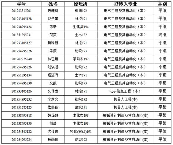 按照《嘉兴学院全日制普通本科生转专业管理办法》(嘉院教字〔2017〕12号)、《机电工程学院转专业实施细则》等文件要求,经学生个人申请,学院资格审核、面试考核,现将拟同意转专业学生名单予以公示。