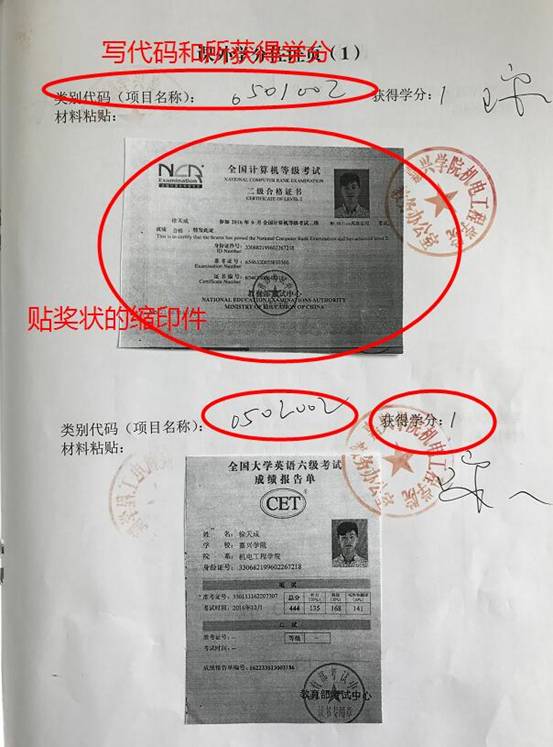 2、课外学分认定主要以审核资料为依据,粘贴证书后必须带上原件来教务办认定学分。竞赛类的如无法提供证书可提供网上公示的名单,科研类直接提供发表的期刊正文,以上材料均需缩小比例牢固粘贴。当认定无资料、资料真伪无法确认或存在异议时,需提交教务办统一上报教务处审核;