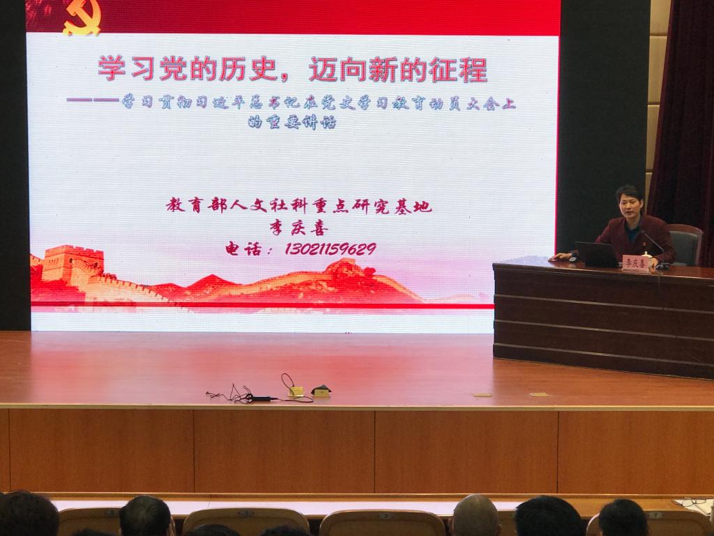 会后,李庆喜博士为学院师生做了题为《学习党的历史,迈向新的征程——学习贯彻习近平总书记在党史学习教育动员大会上的重要讲话》的专题报告。报告从“为什么要开展党史教育”,“从党史中学习什么”,“怎样学好党的历史”三个方面进行了深刻剖析解读,生动地再现了中国共产党的百年峥嵘岁月,用详尽的史料阐述了中国共产党之所以能成为中国革命事业领导的历史必然。李博士指出,中国共产党的历史波澜壮阔,学习党的历史任重道远,我们应当自请长缨,学好党史,深刻理解、全面领会讲话精神,从党的百年历史中汲取继续前进的智慧和力量。