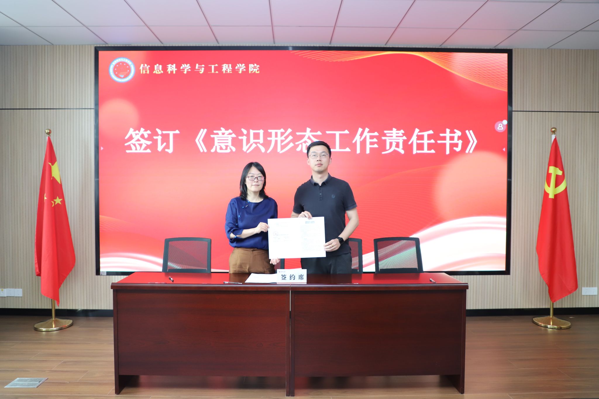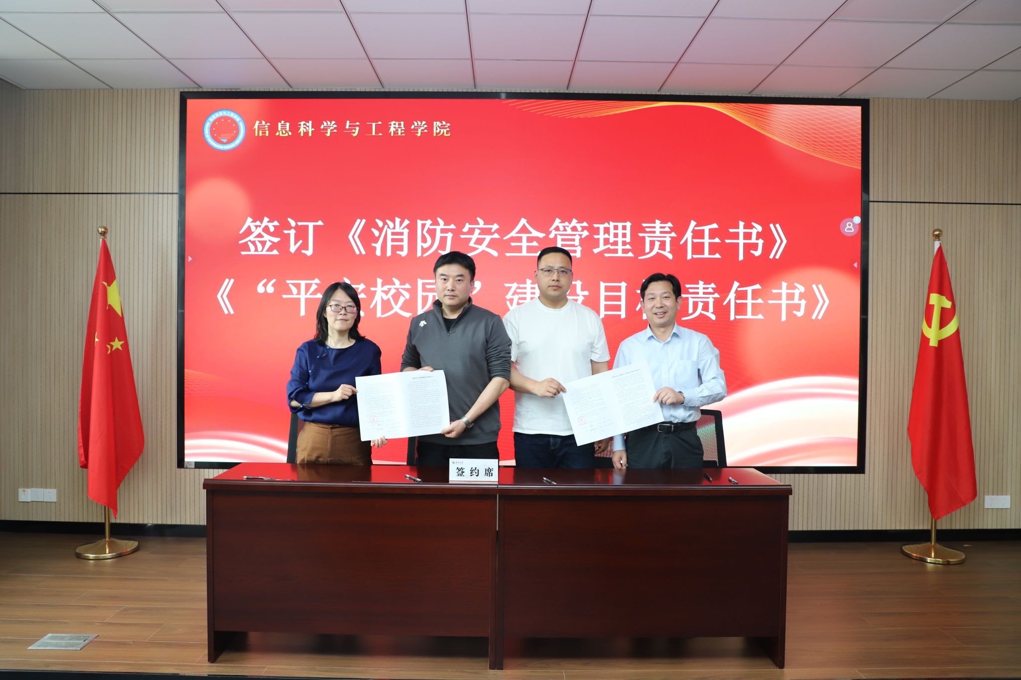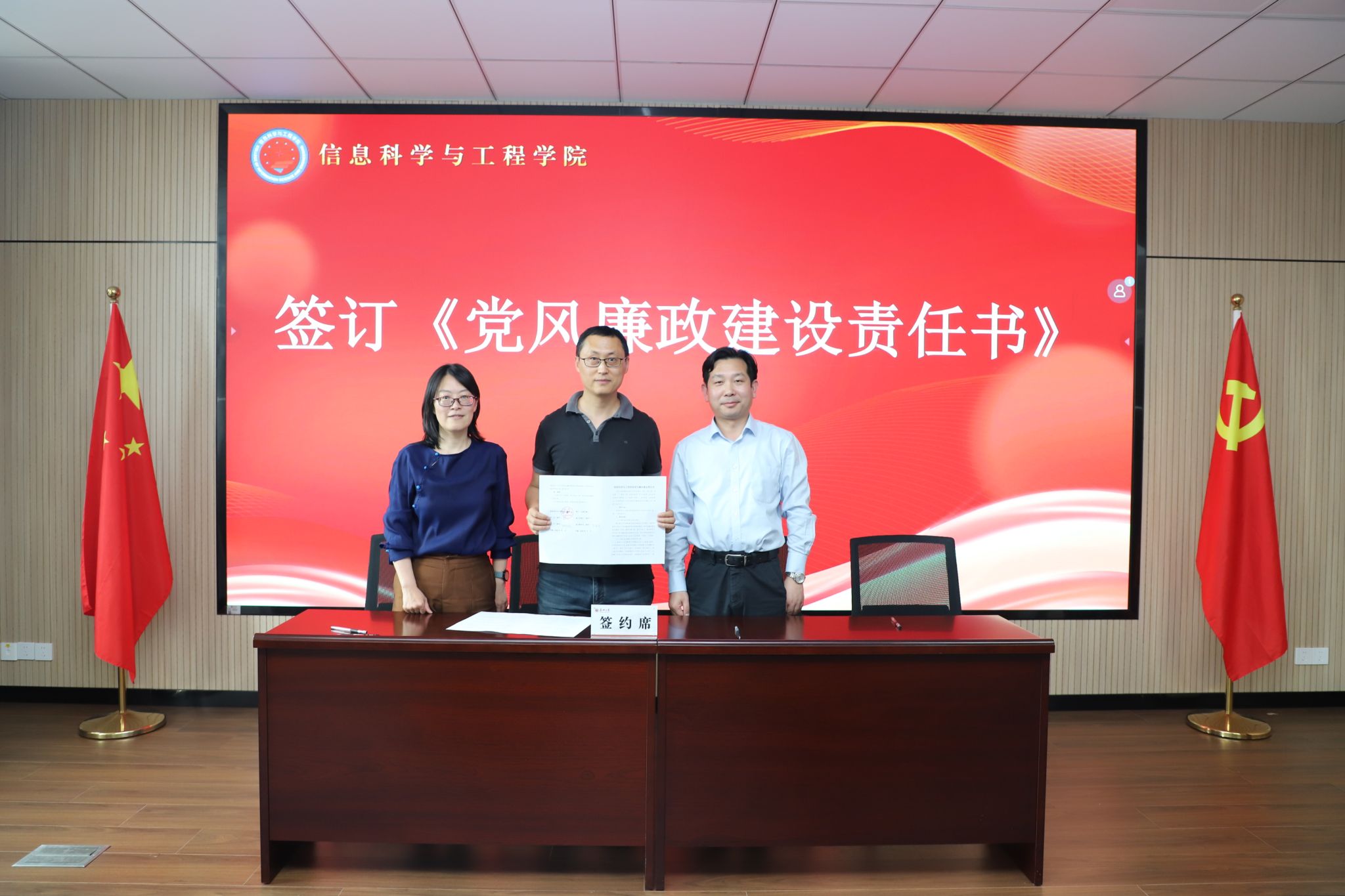 在签约仪式环节,学院党总支书记朱奕远、副院长(主持工作)张先超代表学院与学院各部门主要负责人、党支部书记签订党风廉政建设责任书、意识形态工作责任书、“平安校园”建设目标和消防安全管理责任书。