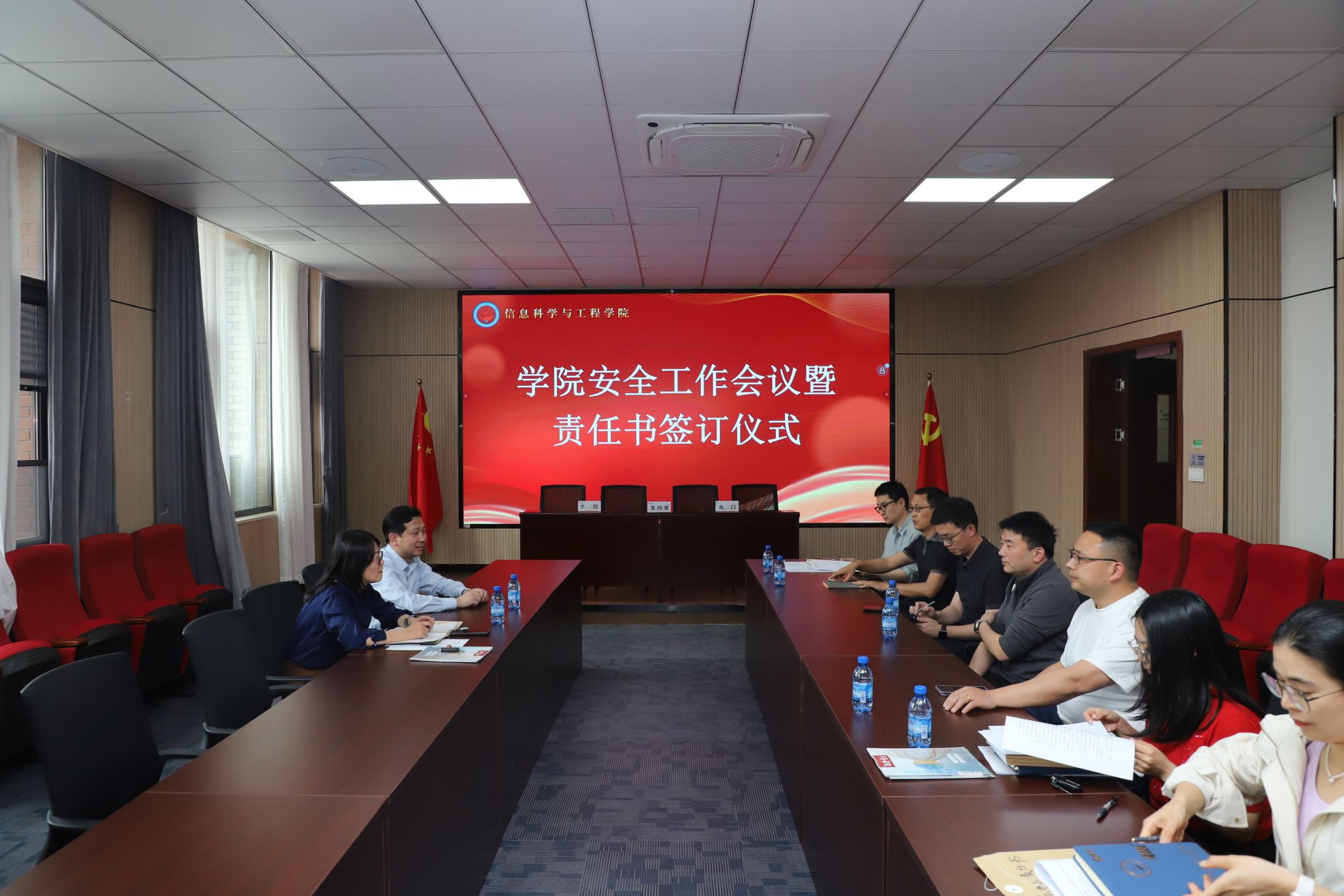 在融信楼会议室召开2025年安全工作会议暨责任书签订仪式。学院党政领导班子、各内设机构主要负责人、党支部书记出席会议。会议由学院党总支书记朱奕远主持。