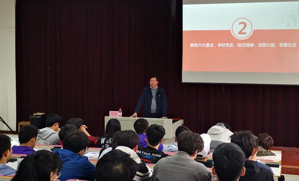 吴书记的报告从带领同学们回顾党的百年光辉历程着手,进而分析了学好党史、领悟红船精神的重要意义,最终围绕作为南湖畔的新时代青年应如何学好党史、领悟红船精神这一命题从六个方面做了具体阐释:一是要感悟思想伟力,在理论学习上要学深学透,在生产实践中要笃信笃行,进一步提升政治定力;二是要把握历史大势,找准历史变革时机,顺势而为,奋发而为,进一步提升人生动力;三是要保持党的团结,始终牢记党的宗旨,自觉做中国特色社会主义坚定信仰者和忠实实践者,进一步提升政治自信;四是要主动应对风险,时刻保持政治警觉,增强工作预见性,不断创新理念思路、体制机制、方法手段,进一步提升创新能力;五是要发扬革命精神,永葆革命本色,切实注重道德素养,进一步坚定树立爱国奉献、爱岗敬业的价值观;六是要牢记党的宗旨,始终保持心系群众冷暖的深厚感情、为民排忧解难的满腔热情和为人民利益奋斗的奔放激情,进一步彰显政治担当。