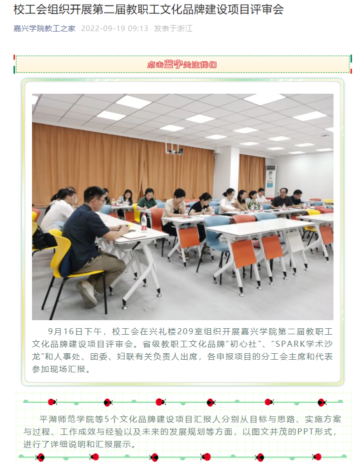 9月16日下午,学院分工会申报的教职工文化品牌项目——《栉风沐雨秉初心 共研共进育新人——学科竞赛育人文化品牌》在兴礼楼209智慧教室进行答辩,经过专家点评,该项目获批嘉兴学院第二届教职工文化品牌建设项目。