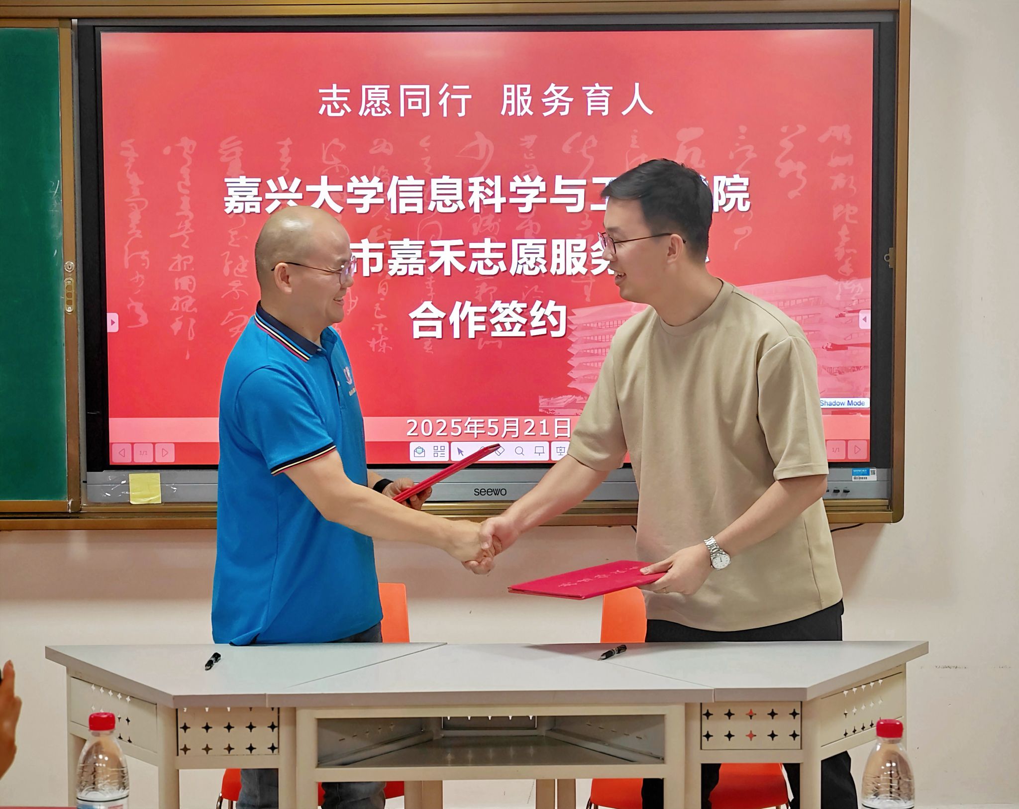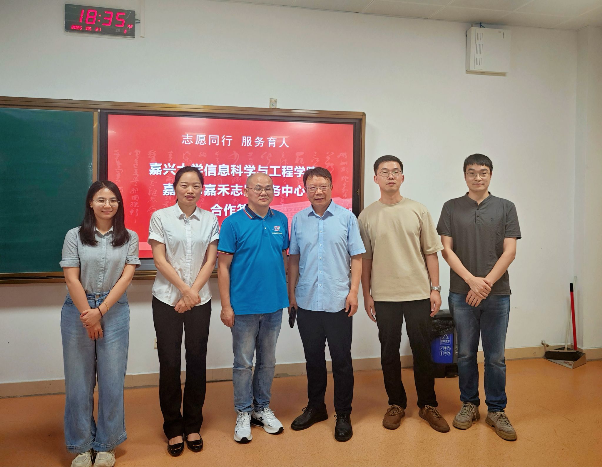5月21日晚上,信息学院与嘉兴市嘉禾志愿服务中心举行了校地合作协同育人签约仪式。信息学院关工委副主任贺征兵,信息学院副教授、研究生导师王超超,嘉兴市嘉禾志愿服务中心理事长左东波、项目经理夏秀珠等出席了活动。